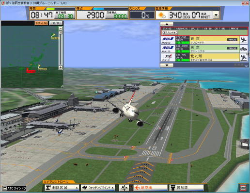 この空港には,ほぼ南北方向に伸びる1本の滑走路があり,国内線旅客ターミナル・国際線旅客ターミナル・自衛隊基地エプロンのほかに,滑走路を挟 んで反対側に海上保安庁の格納庫が存在します。このゲームを通じて知ったのですが,飛行機は向かい風になるように離陸/着陸する(図1:このゲームでの離 陸の様子)ため,風向きによって滑走路に進入する向きが変わります。何となくいつも沖縄本島の北側から着陸することが多いと思っていたのですが,これは風 向きが理由だった訳です(図2:このゲームでの着陸の様子)。ゲームでは管制官役となって飛行機に指示を出して安全な運行を達成するのですが,那覇空港の ように1日の発着便数が非常に多い空港の航空機を取り回す航空管制官のご苦労は大変なものだとわかりました。